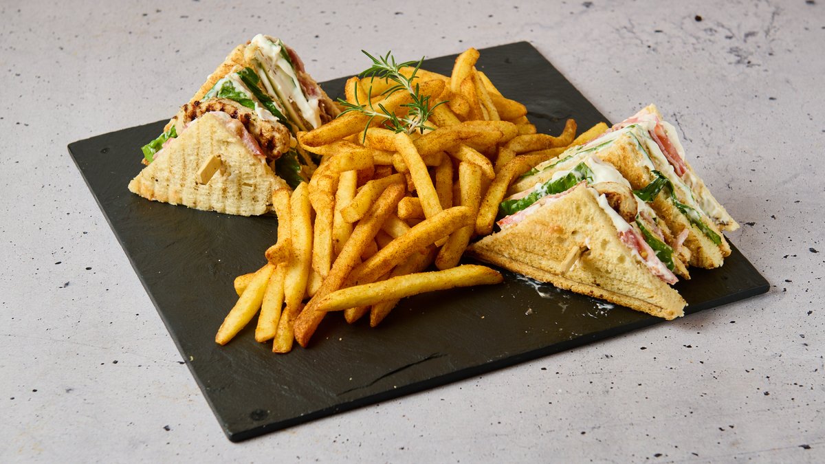 Ψωμί τοστ με gouda, ζαμπόν μπούτι, μπέικον, ντομάτα, μαρούλι και μαγιονέζα. Συνοδεύεται από πατάτες τηγανητές fry `n` dip με μπαχαρικά, σκόρδο και δεντρολίβανο