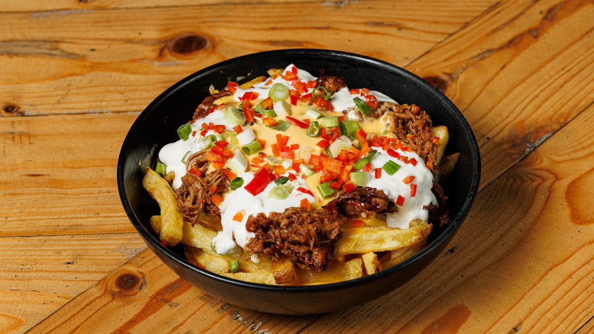 Pulled pork, cheddar sauce, πίκλα κρεμμύδι, πίκλα αγγούρι, sour cream