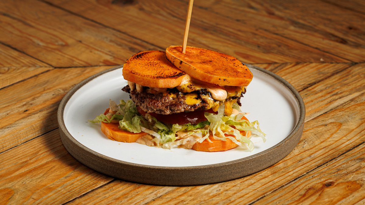 Bun από ψητή γλυκοπατάτα , 2 μπιφτέκια smash, cheddar, iceberg, ντομάτα, κρεμμύδι, bunga mayo