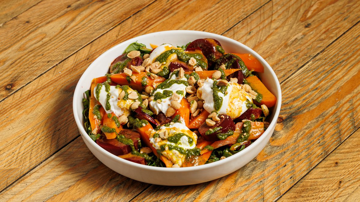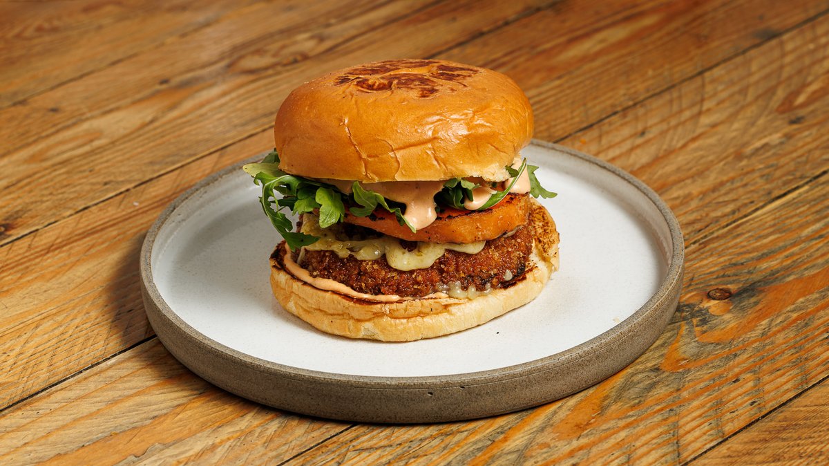 Panko μανιτάρι portobello, τυρί Monterey jack, ψητή γλυκοπατάτα με miso, ρόκα, mexican mayo