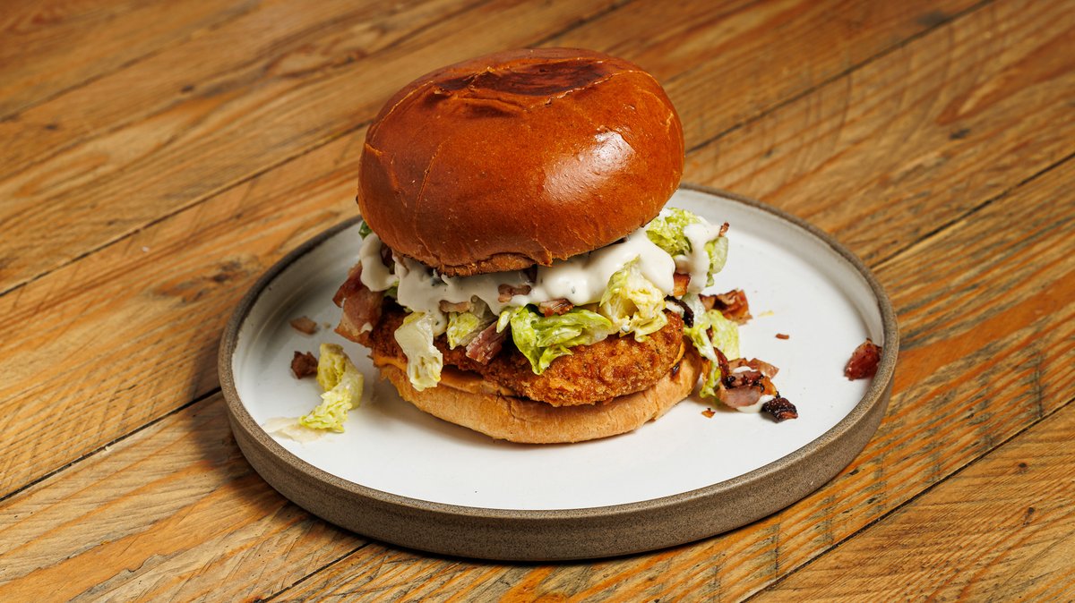 Τηγανητό φιλέτο κοτόπουλο παναρισμένο με panko, καπνιστό provolone, καπνιστή πανσέτα, iceberg, ντομάτα, housemade fried potato chips, secret sauce