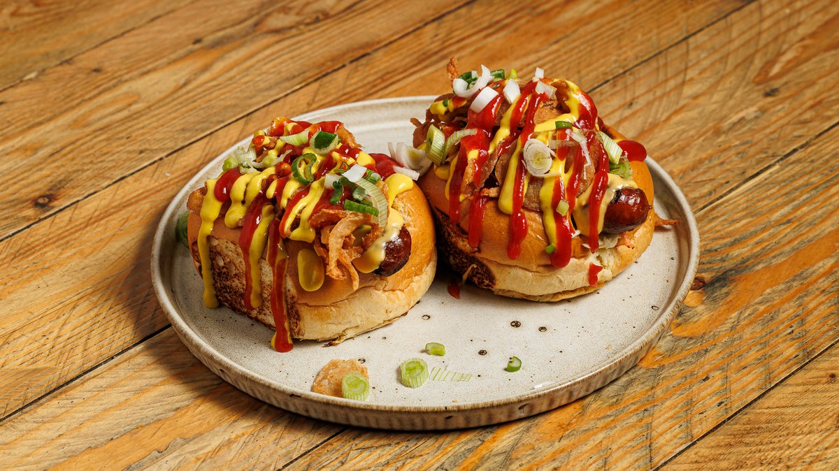 Λουκάνικο chorizo, onion strings, coleslaw, cheedar sauce, sweet pickle relish, mustard, ketchup, φρέσκο κρεμμύδι