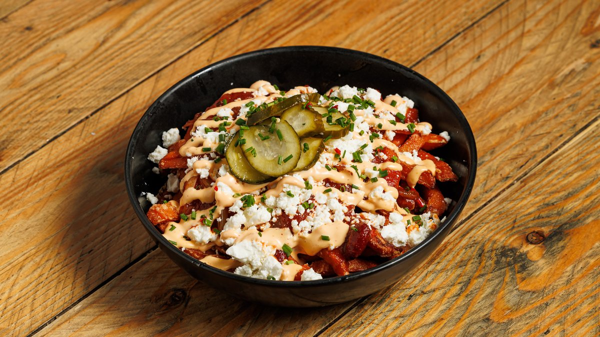 Τηγανητές γλυκοπατάτες, φέτα, πίκλες, mexican sauce, sriracha mayo
