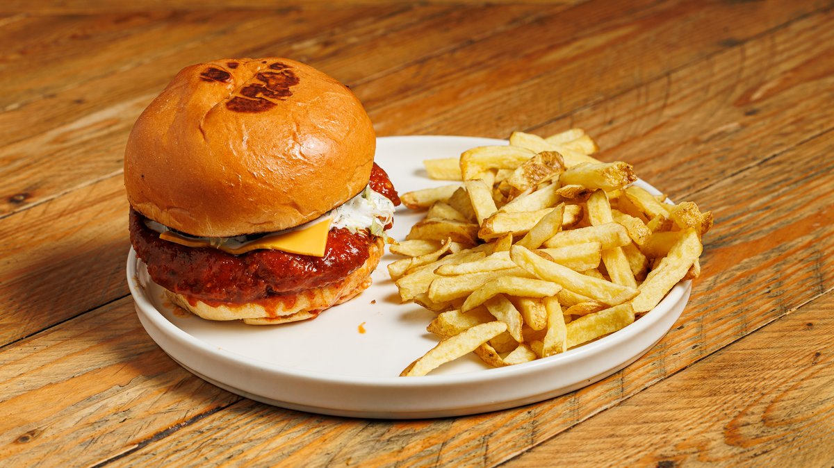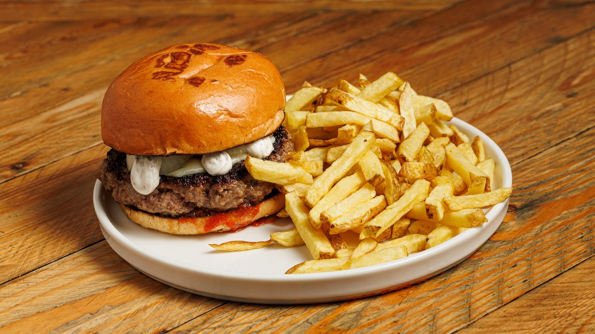 Με brioche (60g) και μπιφτέκι μοσχάρι(90g). Συνοδεύεται με πατάτες τηγανητές