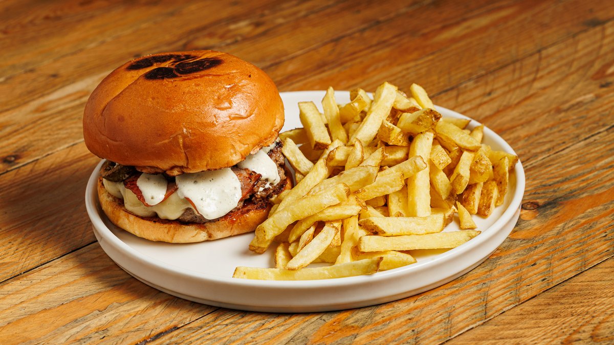 250gr μπιφτέκι μοσχάρι, τυρί raclette, διπλό bacon, avocado, τηγανητό αυγό, chips γλυκοπατάτας, sweetchilli mayo