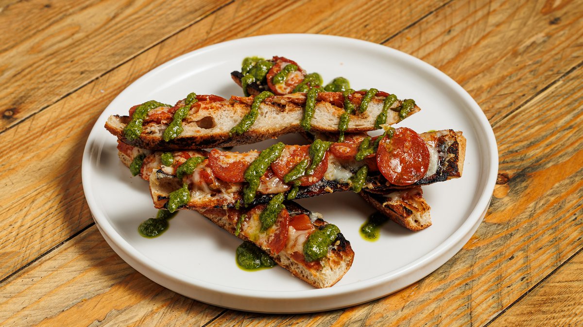 Τραγανή μπαγκέτα, regato, pepperoni, σάλτσα ντομάτας, πέστο βασιλικού