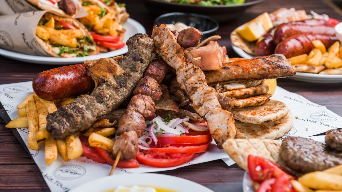 Συνοδεύεται από 2 πίτες, πατάτες τηγανητές, ντομάτα, κρεμμύδι και τζατζίκι