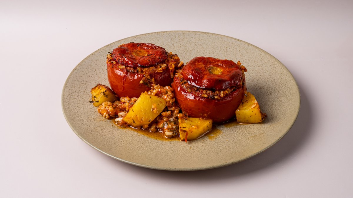 Nτομάτες με ρύζι, μυρωδικά & πατάτες στο φούρνο
