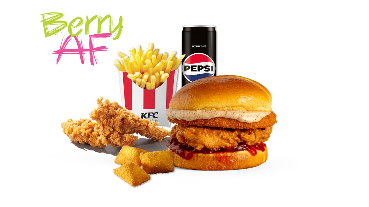 Με ένα Extra AF Berry Burger (ζουμερό φιλέτο κοτόπουλο με potato bun, cream cheese patty, μαρούλι iceberg, truffle sauce και καραμελωμένα κρεμμύδια), 2 Crispy Strips , 3 Cheese Pillows πατάτες, αναψυκτικό 0.33 l!