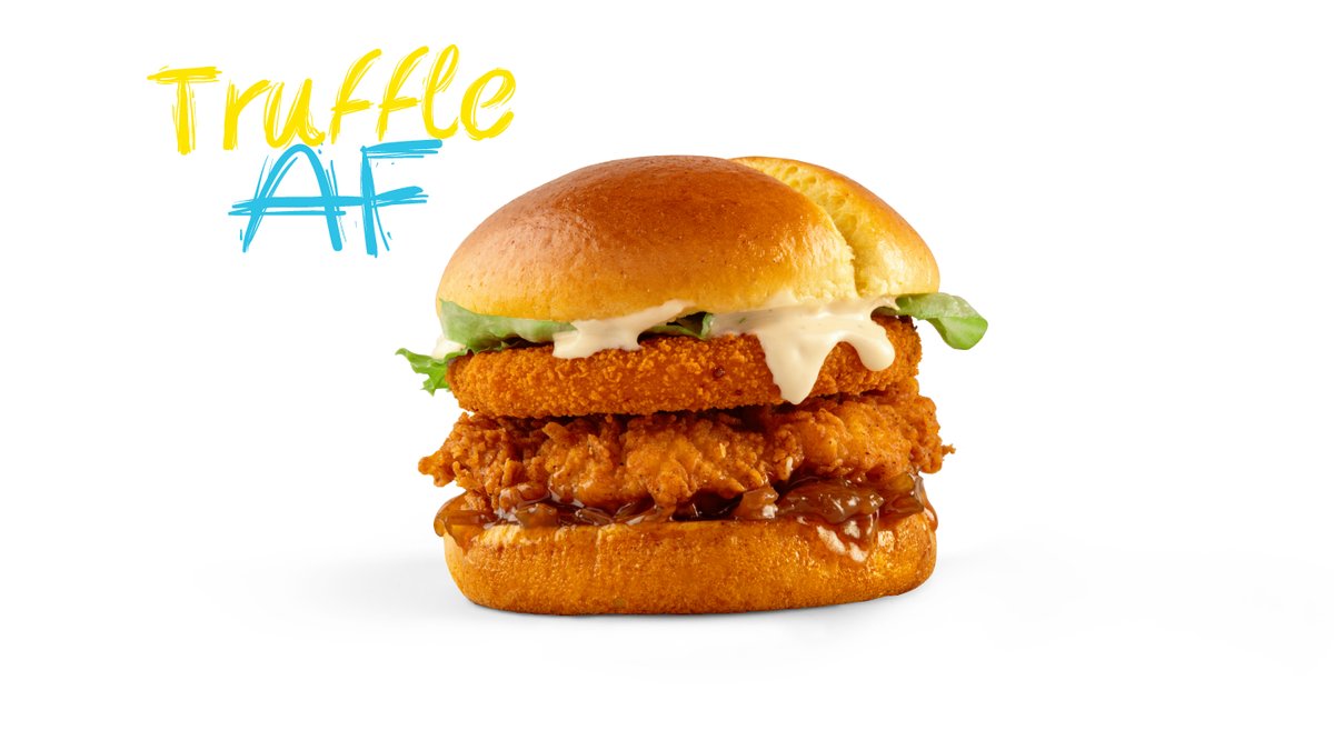 Ζουμερό φιλέτο κοτόπουλο με potato bun, cream cheese patty, μαρούλι iceberg, truffle sauce και καραμελωμένα κρεμμύδια