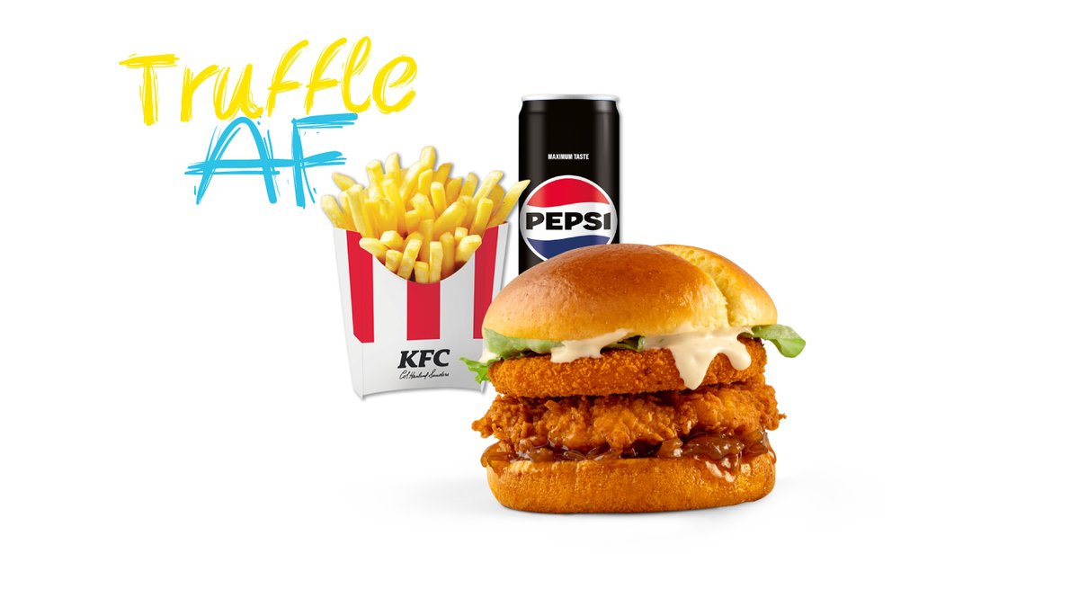 Με ένα Extra AF Berry Burger (ζουμερό φιλέτο κοτόπουλο με potato bun, cream cheese patty, μαρούλι iceberg, truffle sauce και καραμελωμένα κρεμμύδια), πατάτες και αναψυκτικό 0.33 l!