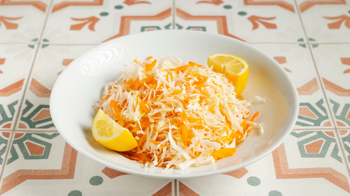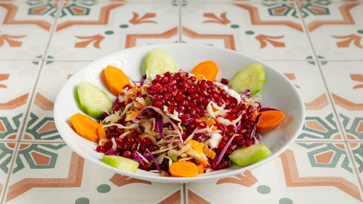 Σαλάτα με άσπρο λάχανο, κόκκινο λάχανο, καρότο, πράσινη πιπεριά, κόκκινη πιπεριά, αγγούρι, σέλινο, ρόδι, λάδι και ξύδι