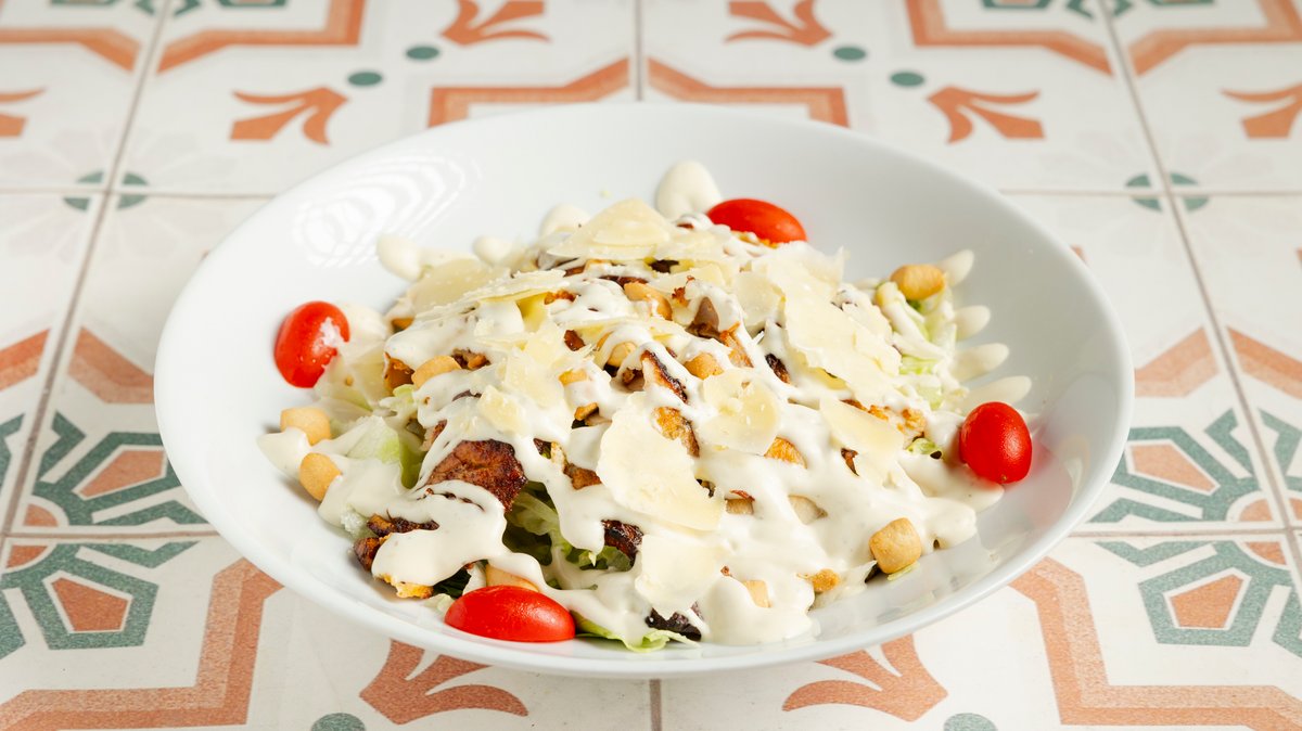 Σαλάτα με κοτόπουλο στήθος, παρμεζάνα, μπέικον, μαρούλι, καλαμπόκι, κρουτόν και Caesar`s sauce