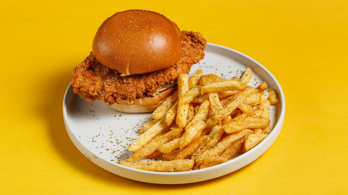 Τηγανητό κοτόπουλο, μαγιονέζα, iceberg και πίκλες. Συνοδεύεται απο πατάτες τηγανητές