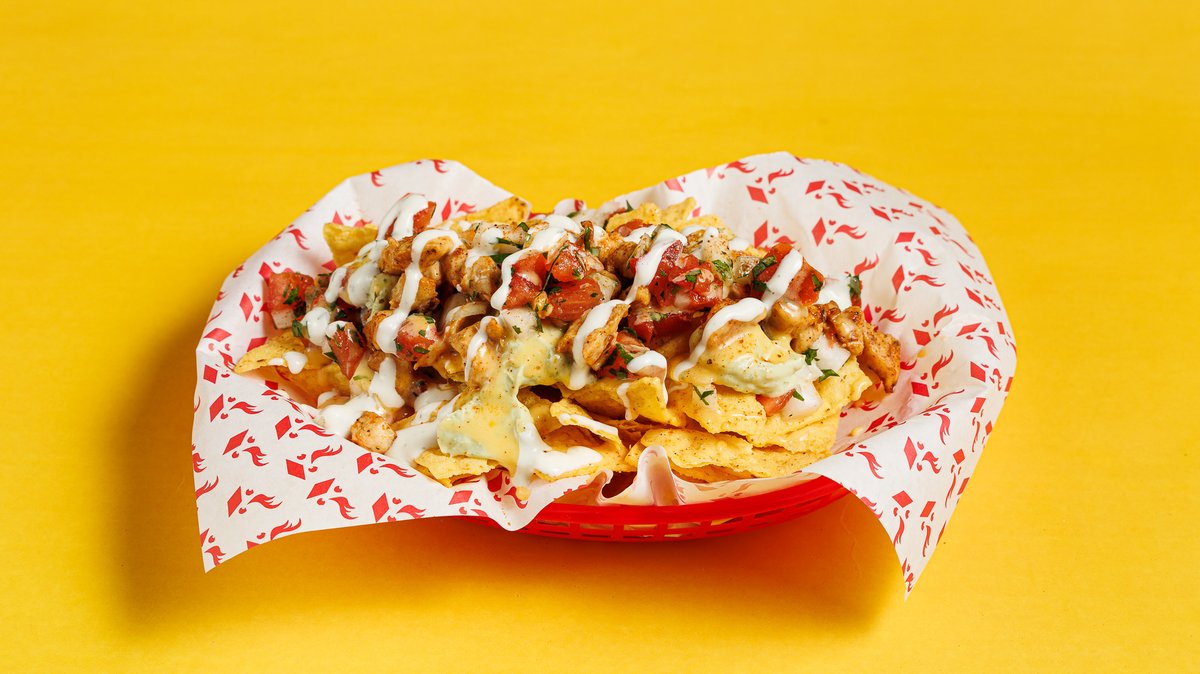 Nachos με κοτόπουλο, cheddar sauce, guacamole sauce, pico de gallo and ranch sauce