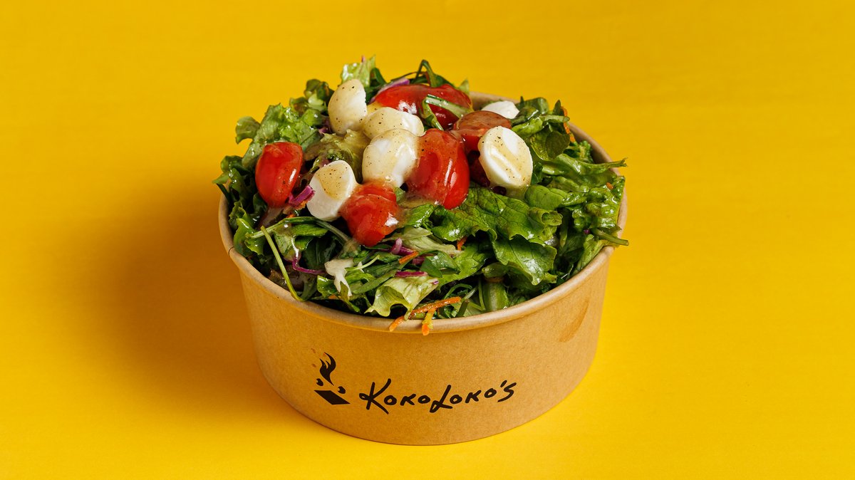 Ανάμεικτη πράσινη σαλάτα με καρότο, κόκκινο λάχανο, ντοματίνια, φρέσκια mozzarella και honey ginger sauce