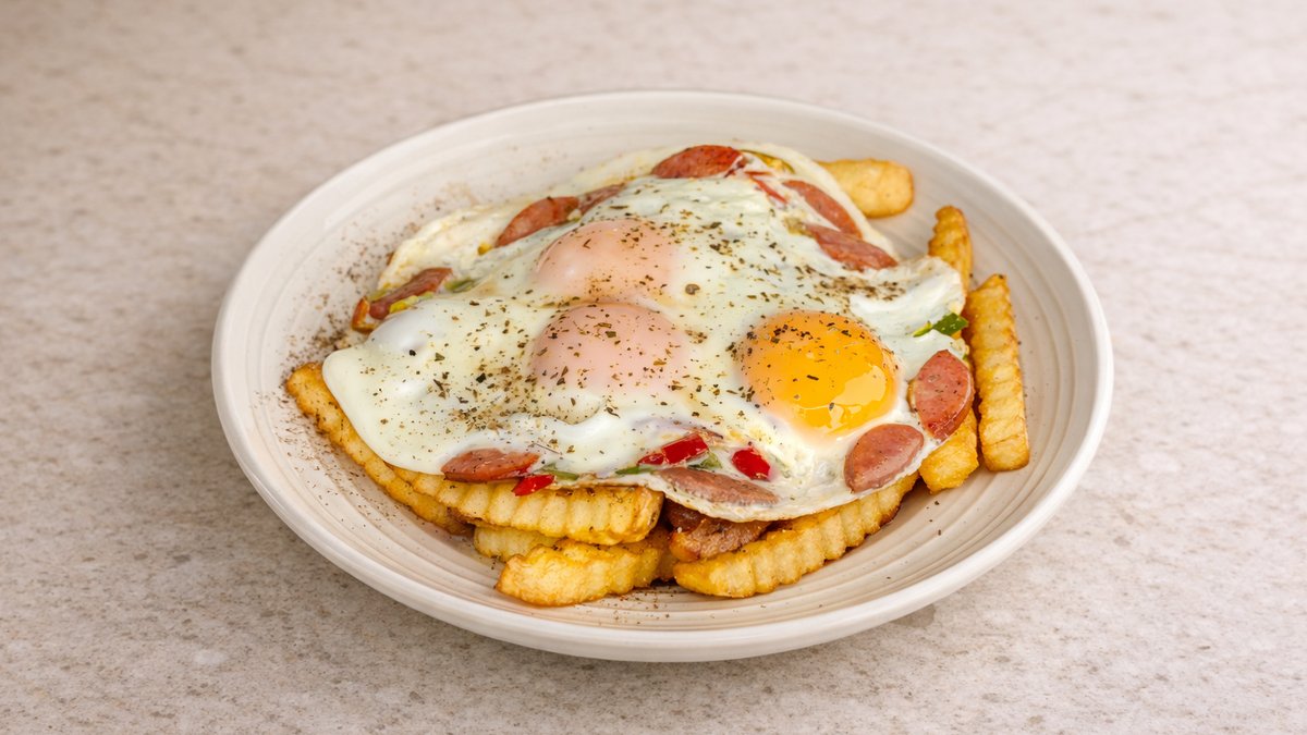 3 αυγά. Με χωριάτικο λουκάνικο, gouda και φέτα. Συνοδεύεται με ανάμεικτη πράσινη σαλάτα ή φρεσκοτηγανισμένες πατάτες krisspy