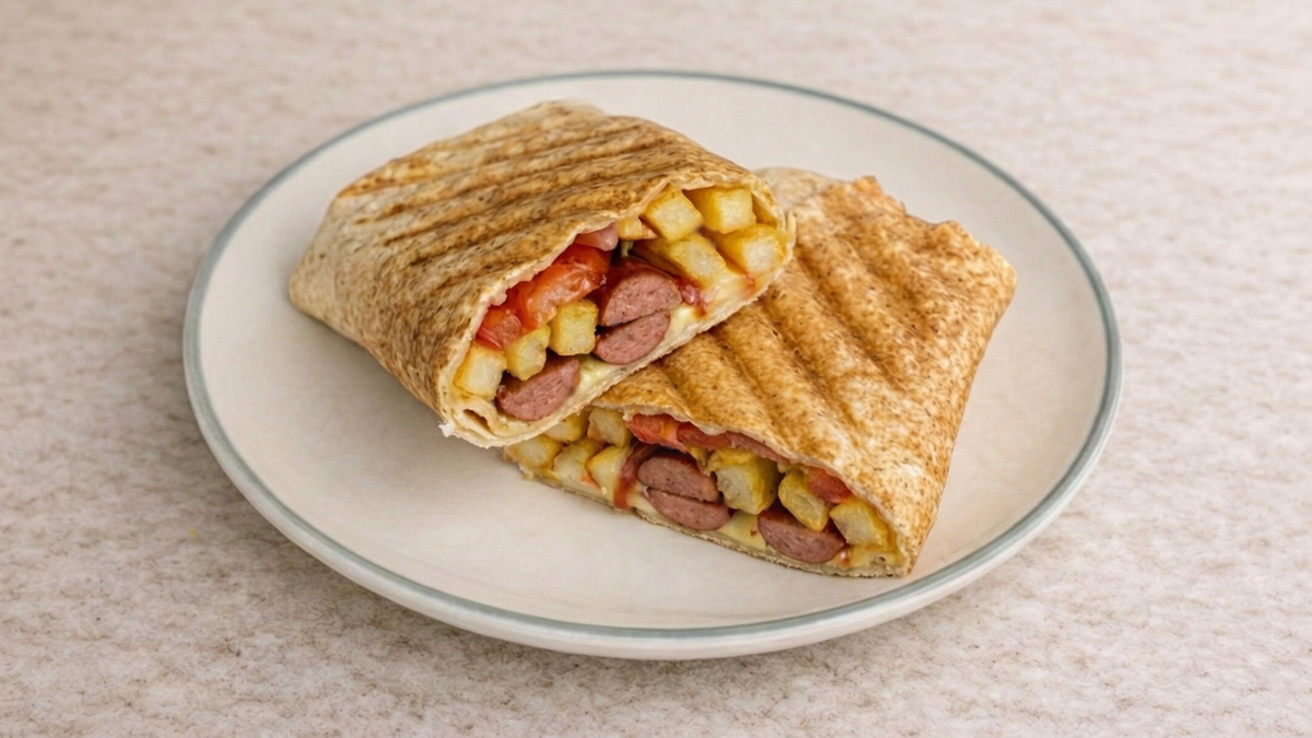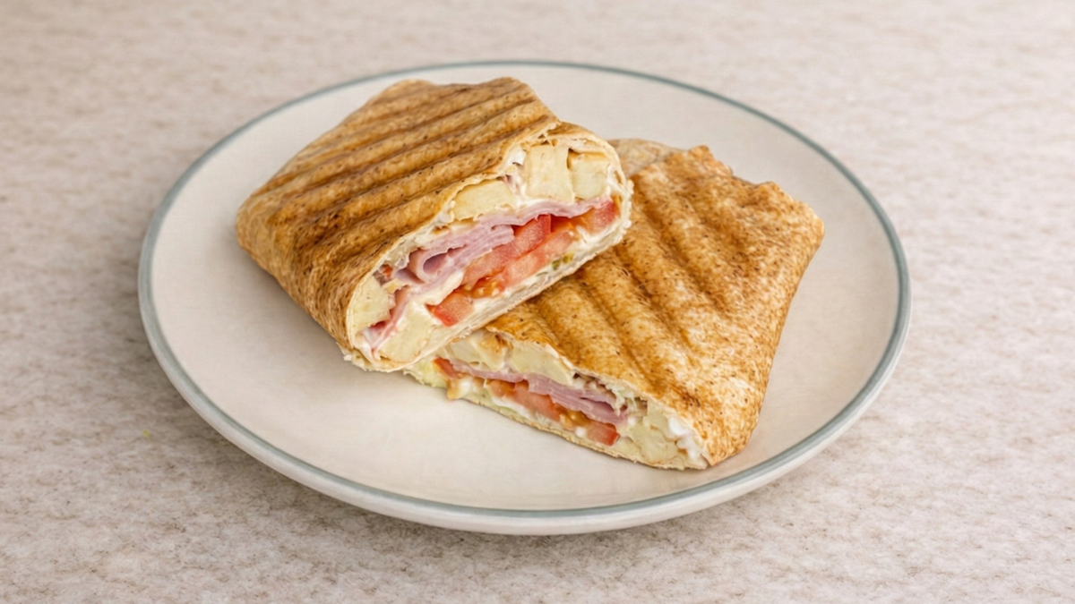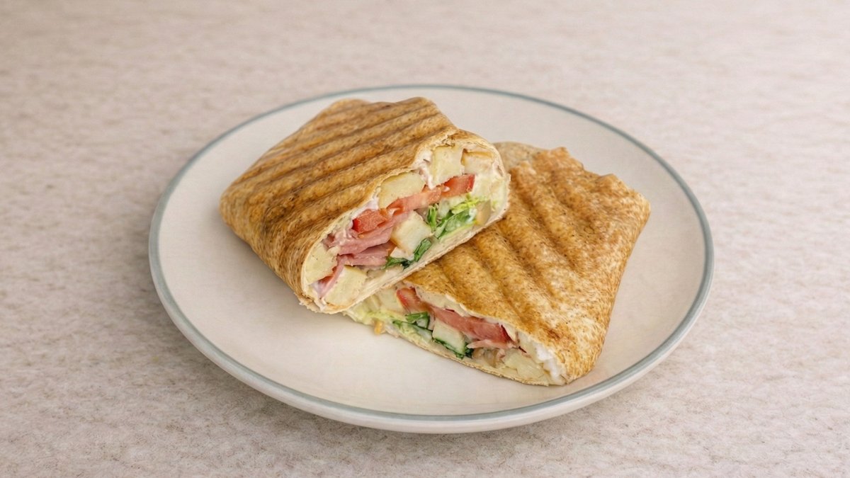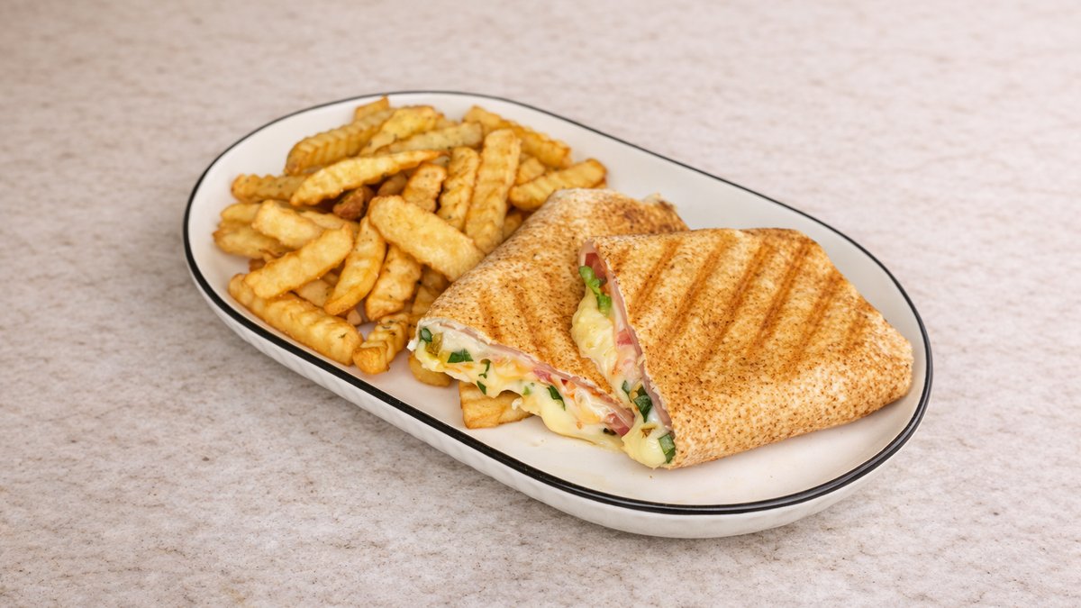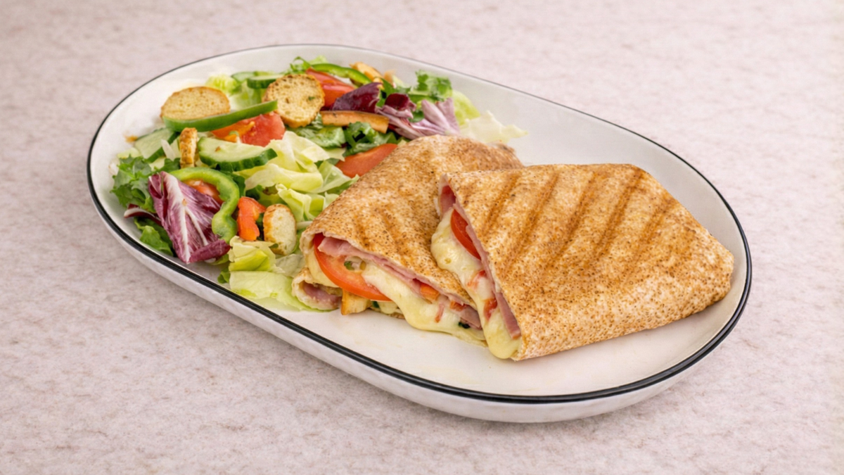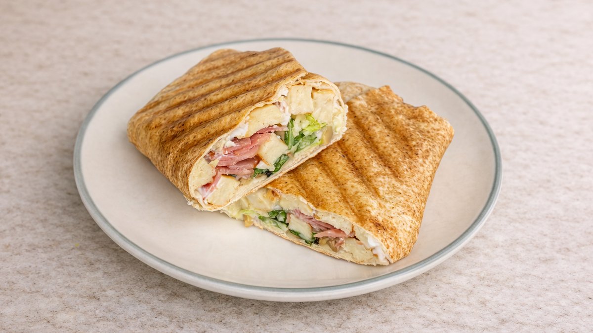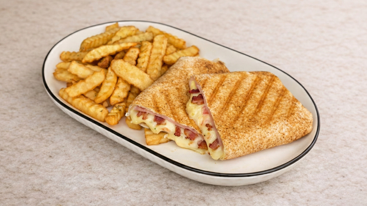 Αραβική πίτα με φιλετάκια ψητό κοτόπουλο, μπέικον, τυρί gouda, ντομάτα και γαλλική σαλάτα