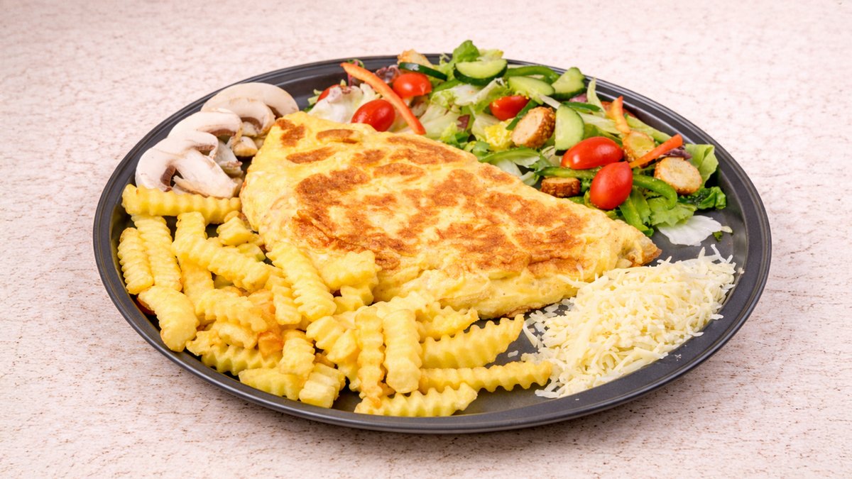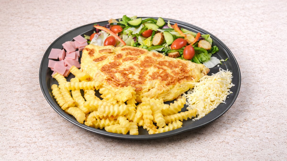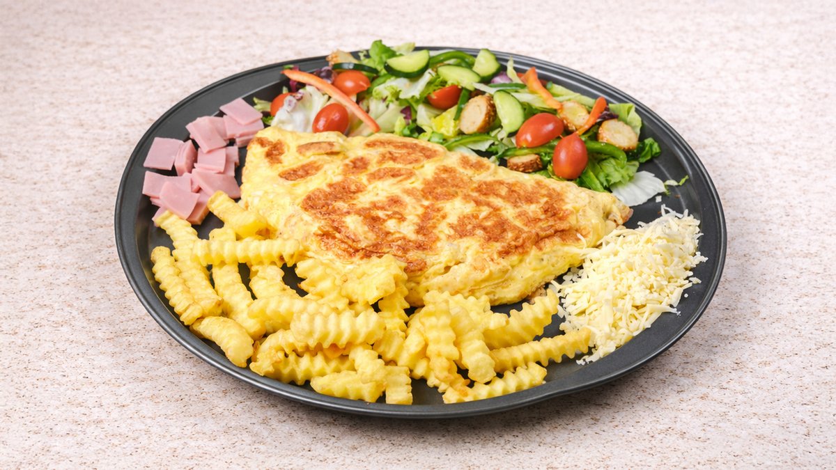 3 αυγά. Με ζαμπόν, gouda και γραβιέρα. Συνοδεύεται με ανάμεικτη πράσινη σαλάτα ή φρεσκοτηγανισμένες πατάτες krisspy