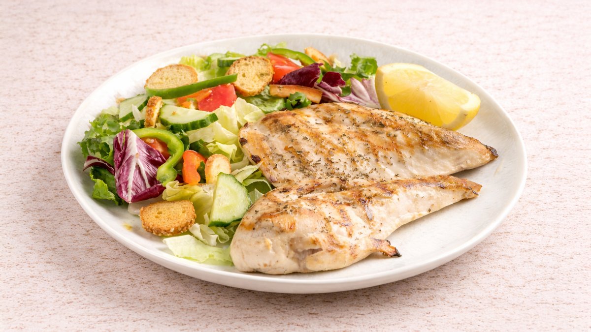 Φρέσκο φιλέτο από στήθος κοτόπουλο, μαριναρισμένο σε μυρωδικά, ψημένο στη σχάρα. Συνοδεύεται από γαρνιτούρα της επιλογής σου