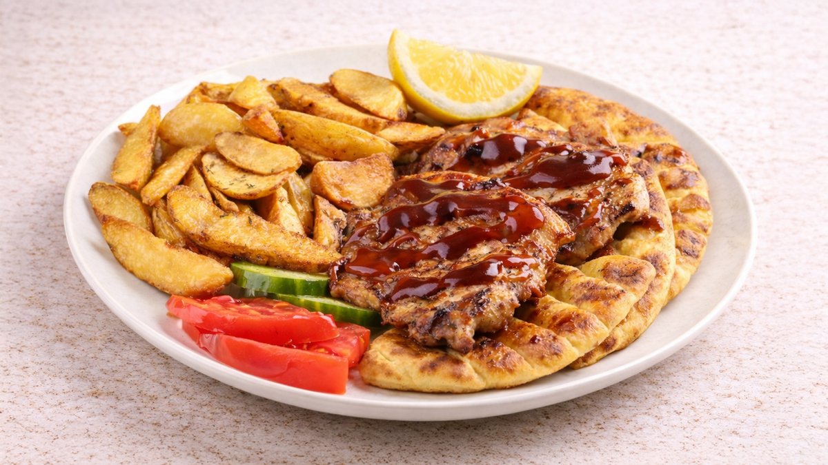Φρέσκα χοιρινά μπριζολάκια λαιμού, μαριναρισμένα σε μυρωδικά με θρούμπι, ρίγανη και λεμόνι, ψημένα στη σχάρα. Συνοδεύονται με πιττάκια καλαμποκιού, φρεσκοτηγανισμένες πατάτες country και BBQ σως
