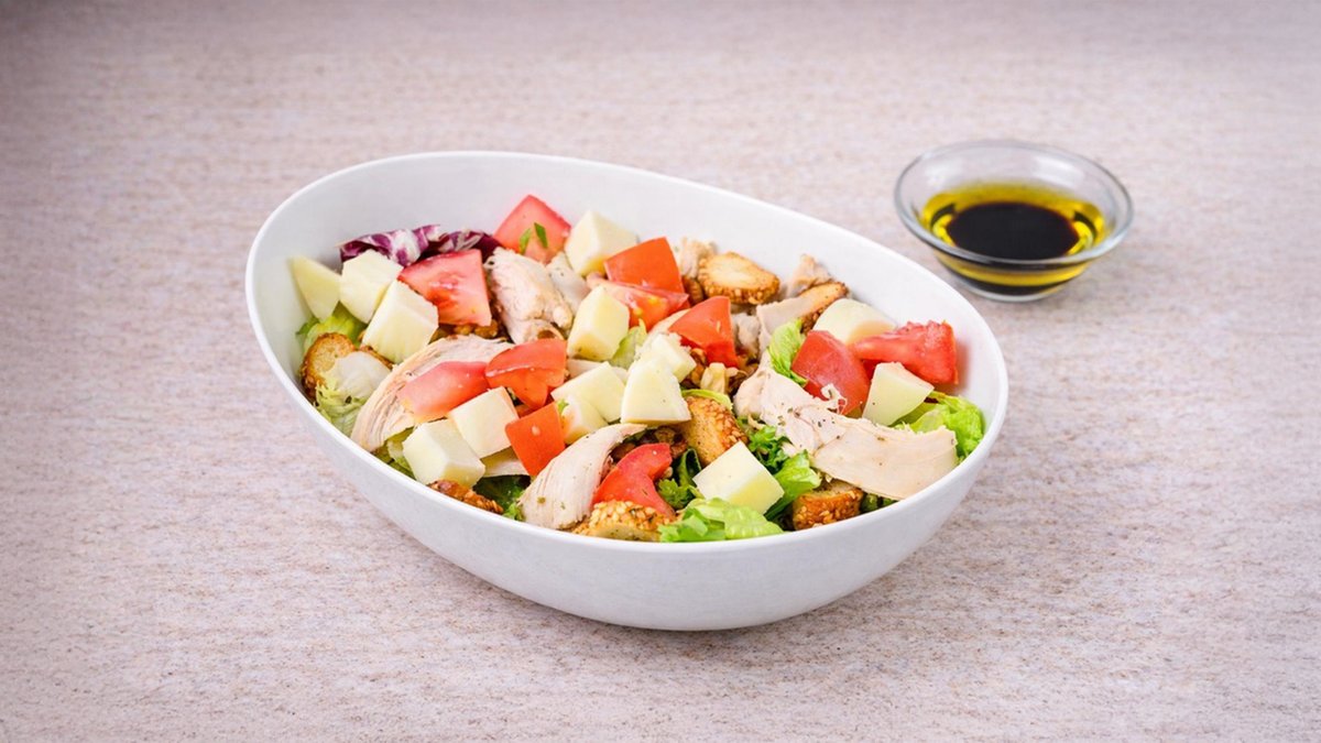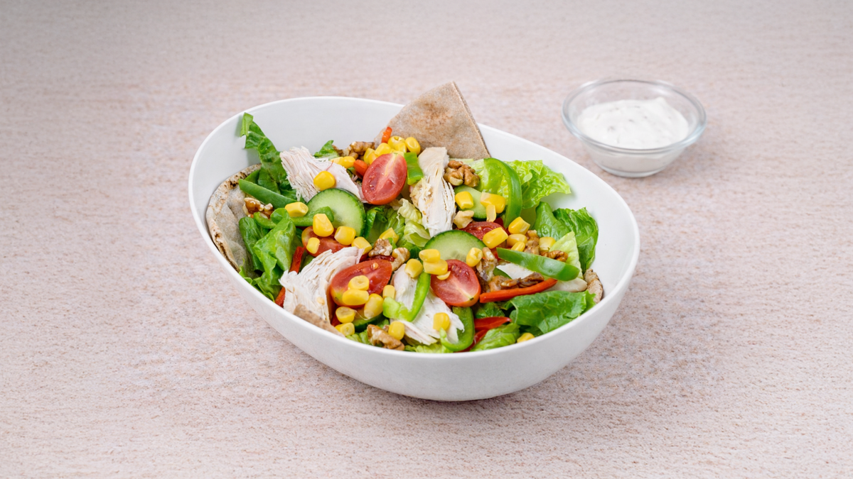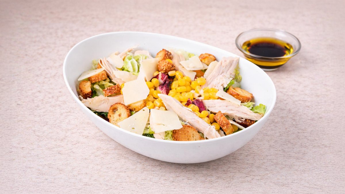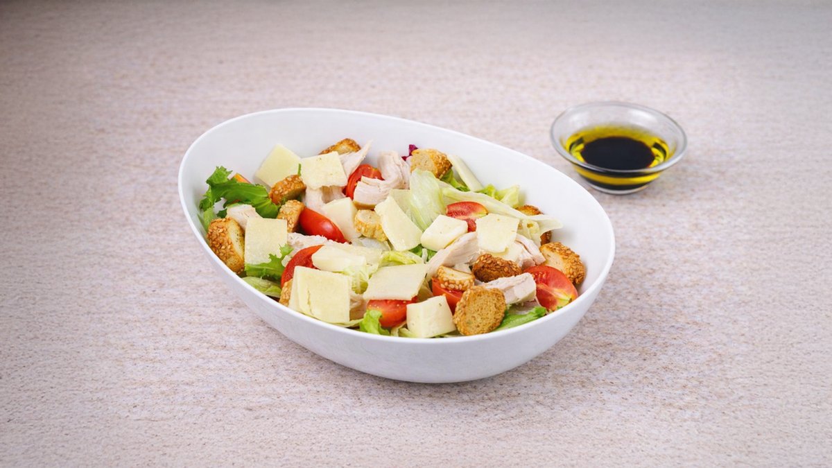 Σαλάτα με ανάμεικτα πράσινα λαχανικά, φρέσκο στήθος κοτόπουλο, καλαμπόκι, παρμεζάνα, κρουτόν, λάδι και βαλσάμικο. Συνοδεύεται από ψωμί μπαγκέτας και σως ξεχωριστά