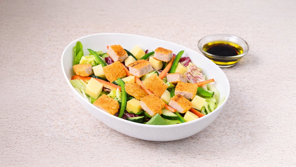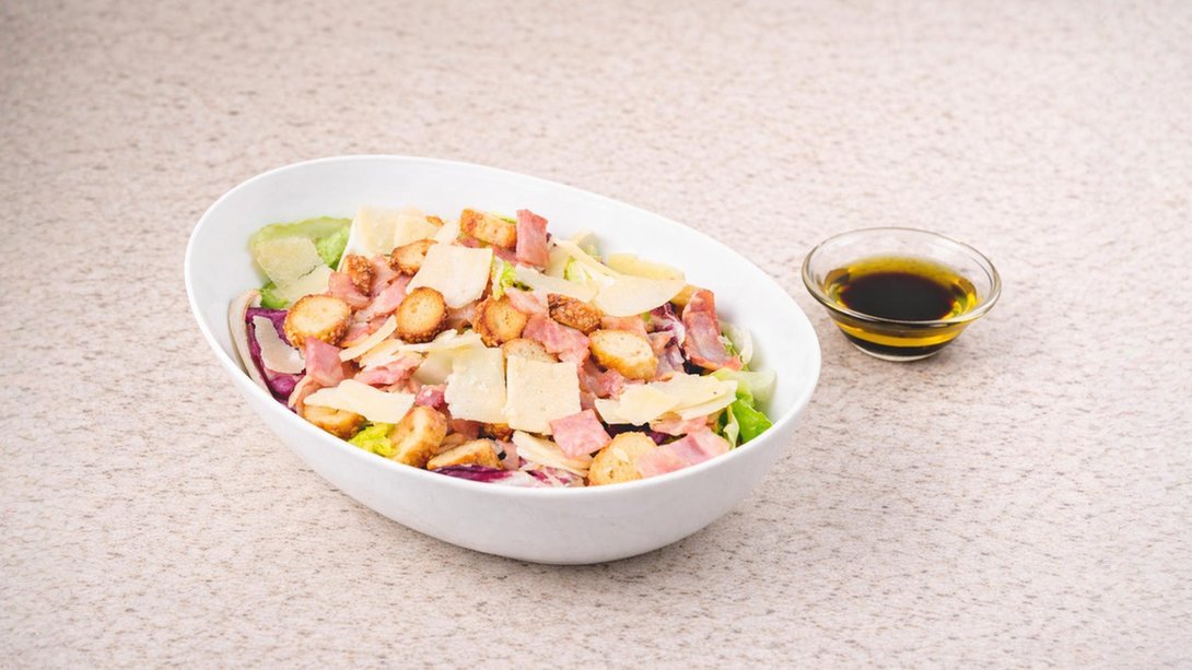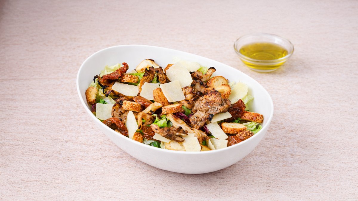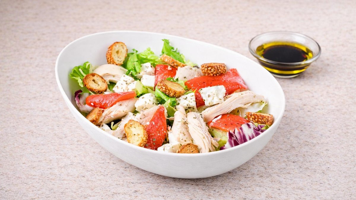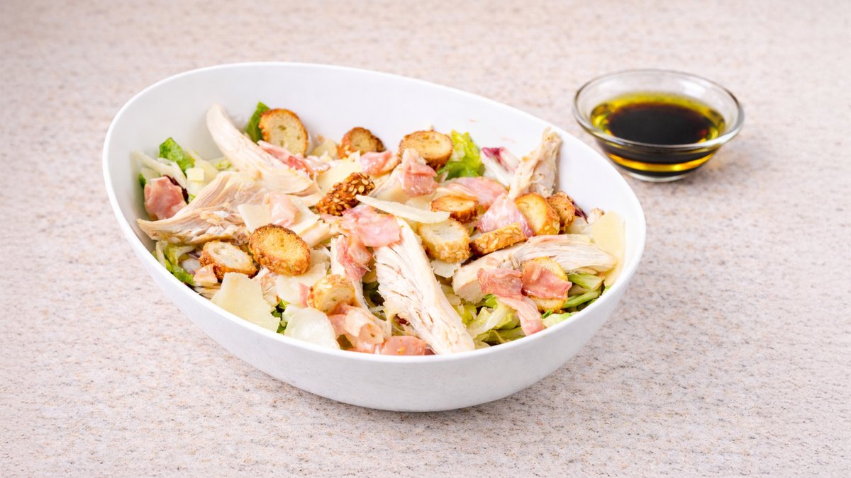 Σαλάτα με ανάμεικτα πράσινα λαχανικά, φρέσκο στήθος κοτόπουλο, καλαμπόκι, παρμεζάνα, κρουτόν, λάδι και βαλσάμικο. Συνοδεύεται από ψωμί μπαγκέτας και σως ξεχωριστά