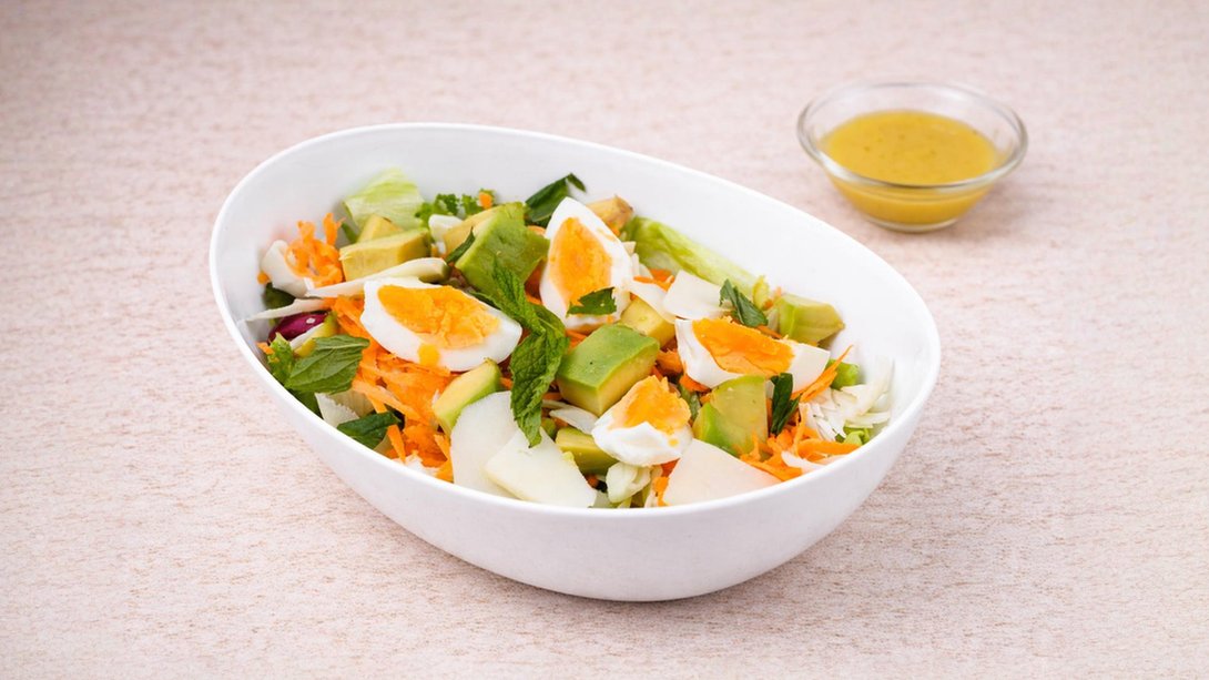 Νόστιμη και θρεπτική σαλάτα με ανάμεικτα πράσινα λαχανικά, λάχανο, καρότο, αβοκάντο, αυγό, τριμμένη γραβιέρα σε πικάντικη sauce μουστάρδας. Συνοδεύονται με ψωμί και sauce