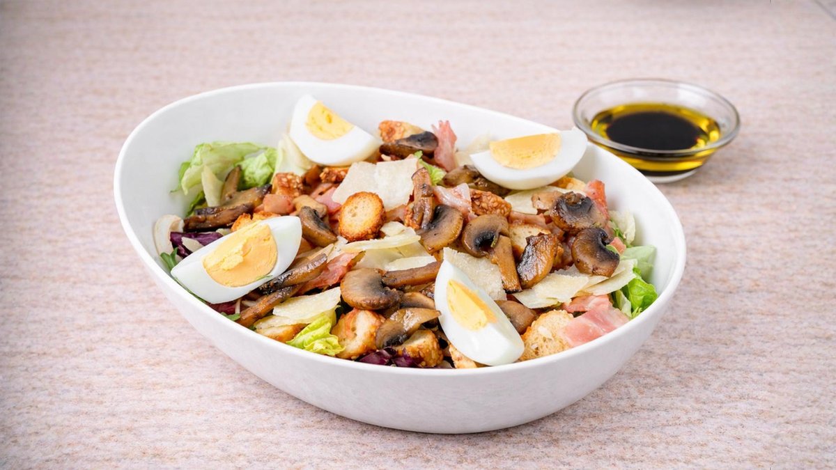 Μαρούλι, σπανάκι, φρέσκα μανιτάρια σωτέ, μπέικον, αυγό, κρουτόν, παρμεζάνα και dressing λάδι/μπαλσάμικο/μουστάρδα. Συνοδεύονται με ψωμί και sauce
