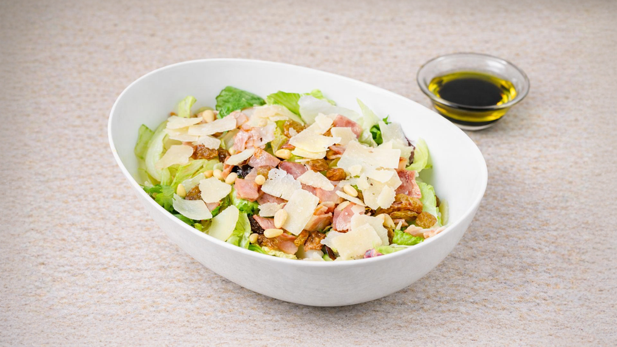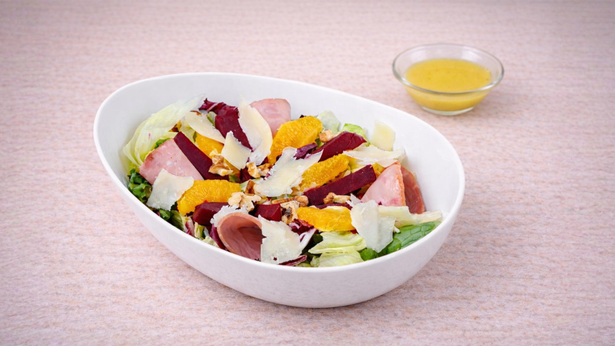Ανάμεικτα πράσινα λαχανικά, παντζάρια, φρυγανισμένο προσούτο, φέτες πορτοκαλιού, καρύδια, flakes παρμεζάνας σε sauce μελιού. Συνοδεύονται με ψωμί και sauce