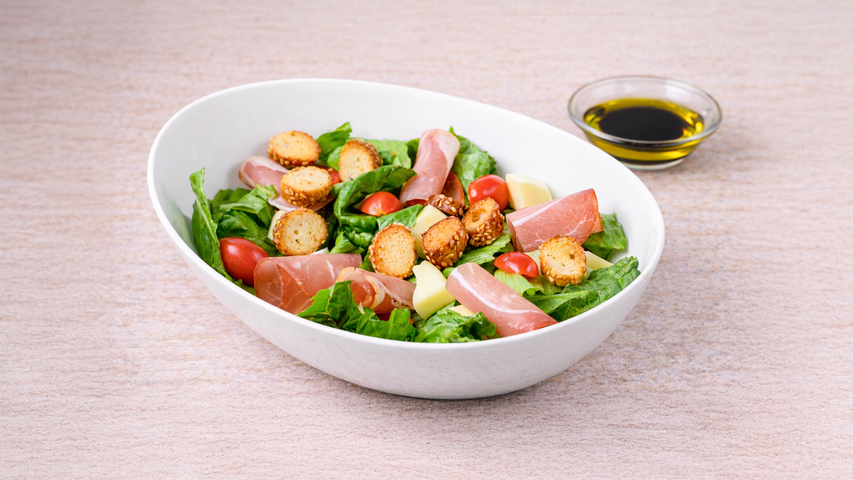 Μαρούλι, σπανάκι, ντοματίνια, προσούτο, κρουτόν, μοτσαρέλα και dressing λάδι/μπαλσάμικο. Συνοδεύονται με ψωμί και sauce