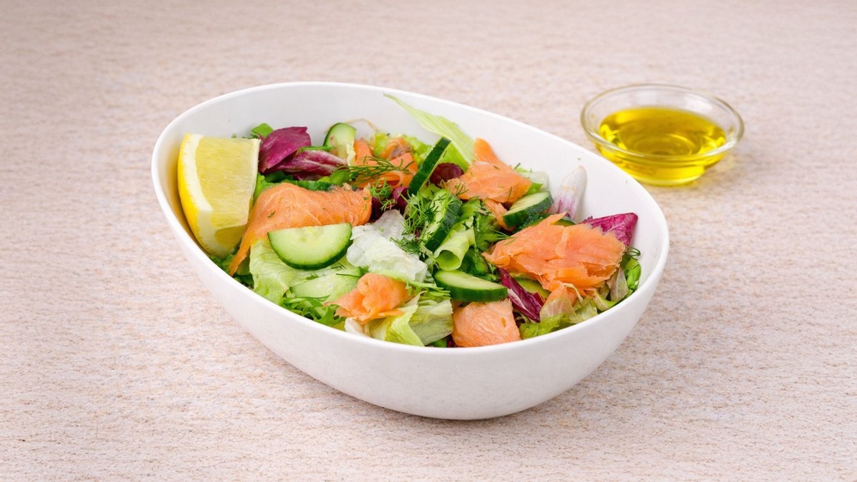 Ανάμεικτα πράσινα λαχανικά, αγγούρι, καπνιστό σολομό, άνηθο και dressing λάδι/λεμόνι. Συνοδεύονται με ψωμί και sauce