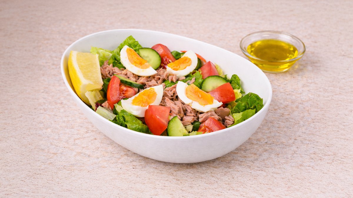 Μαρούλι, τόνο, άνηθο, ντομάτα, αγγούρι, αυγό και dressing λάδι/λεμόνι. Συνοδεύονται με ψωμί και sauce