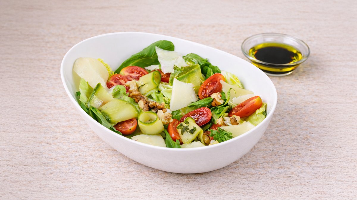 Γαλλική σαλάτα, ρόκα, φρέσκο κολοκυθάκι μαριναρισμένο σε χυμό λεμονιού, ντοματίνια, γραβιέρα Κρήτης, καρύδια και dressing μελιού. Συνοδεύονται με ψωμί και sauce