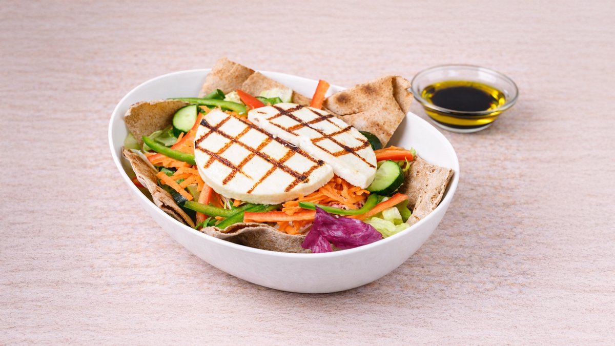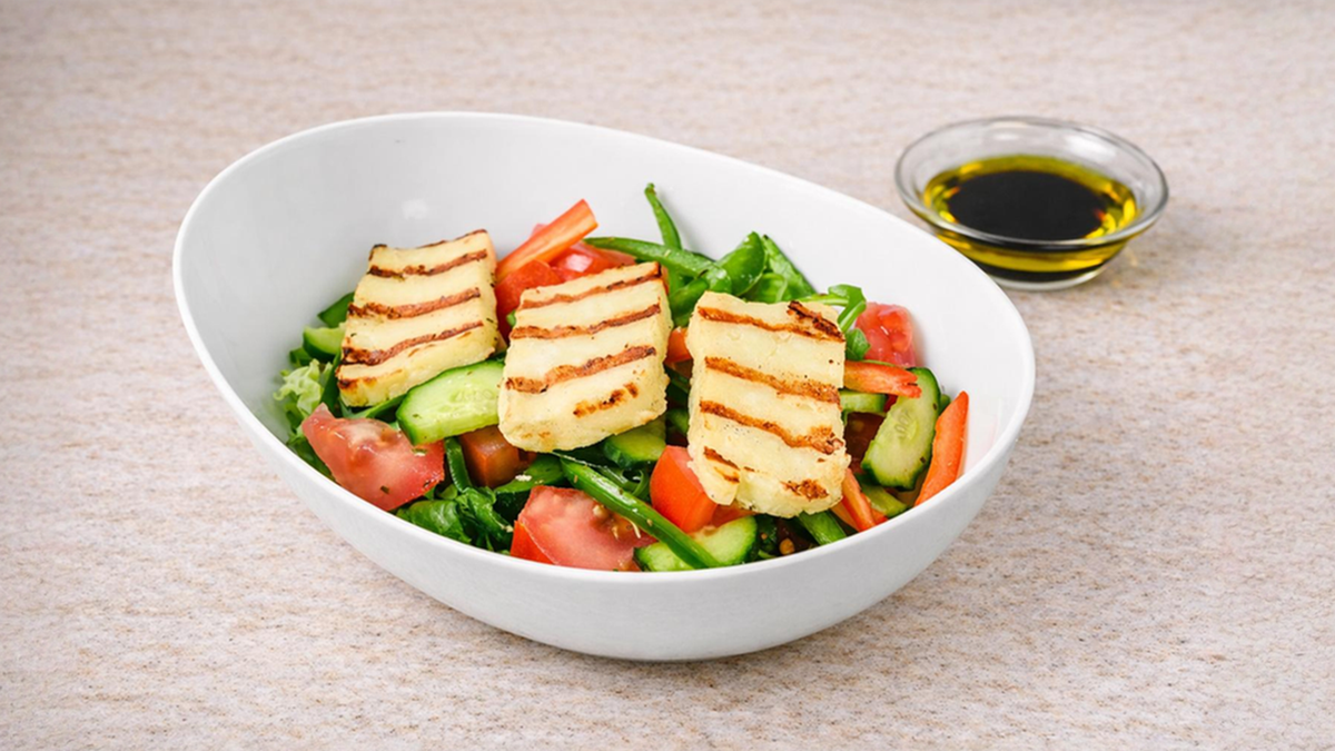 Σαλάτα με μαρούλι, σπανάκι, ντομάτα, αγγούρι, χαλούμι ψητό, πιπεριές χρωματιστές, λάδι και βαλσάμικο. Συνοδεύεται από ψωμί μπαγκέτας και σως ξεχωριστά