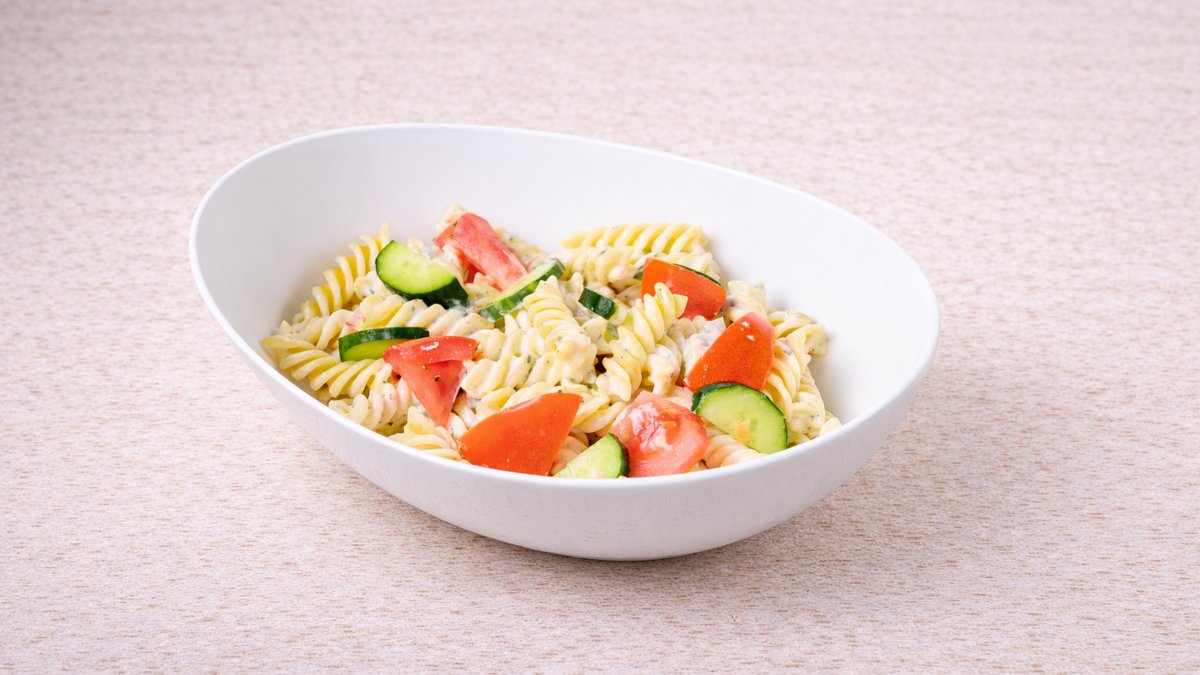 Μακαρόνια βίδες με τόνο, αγγούρι, ντομάτα και dressing μαγιονέζας με μυρωδικά