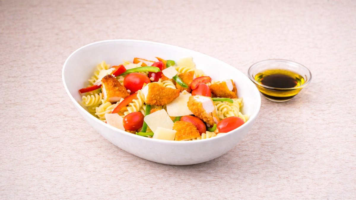 Μακαρόνια βίδες με κοτομπουκιές, χρωματιστές πιπεριές, ντοματίνια, παρμεζάνα και dressing λάδι-βαλσάμικο. Συνοδεύεται από ψωμί μπαγκέτας και σως ξεχωριστά