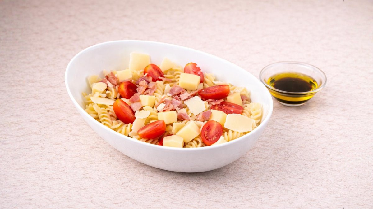 Μακαρόνια βίδες με ντοματίνια, μπέικον, τυρί gouda, παρμεζάνα και dressing λάδι-βαλσάμικο. Συνοδεύεται από ψωμί μπαγκέτας και σως ξεχωριστά