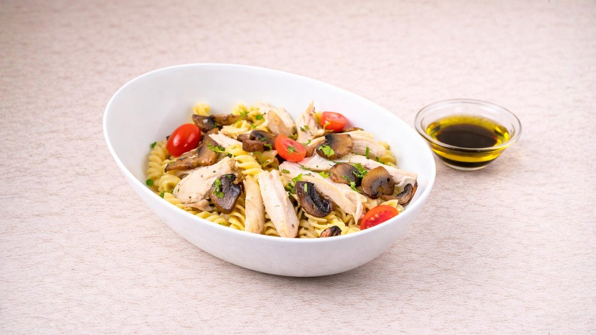 Μακαρόνια βίδες με ντοματίνια, φρέσκο στήθος κοτόπουλο, φρέσκα μανιτάρια σωτέ, μαϊντανό και dressing λάδι-βαλσάμικο. Συνοδεύεται από ψωμί μπαγκέτας και σως ξεχωριστά