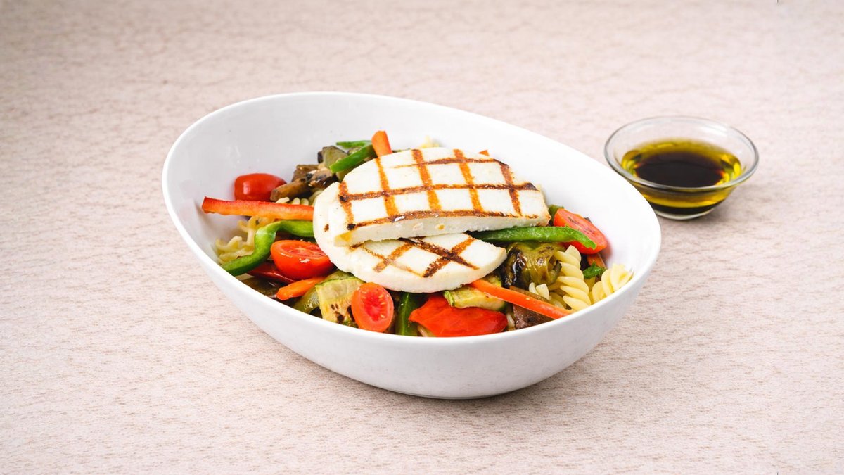Μακαρόνια βίδες με ψητά λαχανικά, ντοματίνια, φρέσκα μανιτάρια σωτέ, χρωματιστές πιπεριές, ψητό μανούρι και dressing λάδι-βαλσάμικο. Συνοδεύεται από ψωμί μπαγκέτας και σως ξεχωριστά