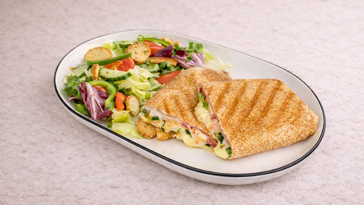 Ανάμεικτα πράσινα λαχανικά, ψητό μανούρι, ντοματίνια, αγγούρι, χρωματιστές πιπεριές, καρότο, ψητή αραβική πίτα και dressing λάδι/μπαλσάμικο. Συνοδεύονται με ψωμί και sauce