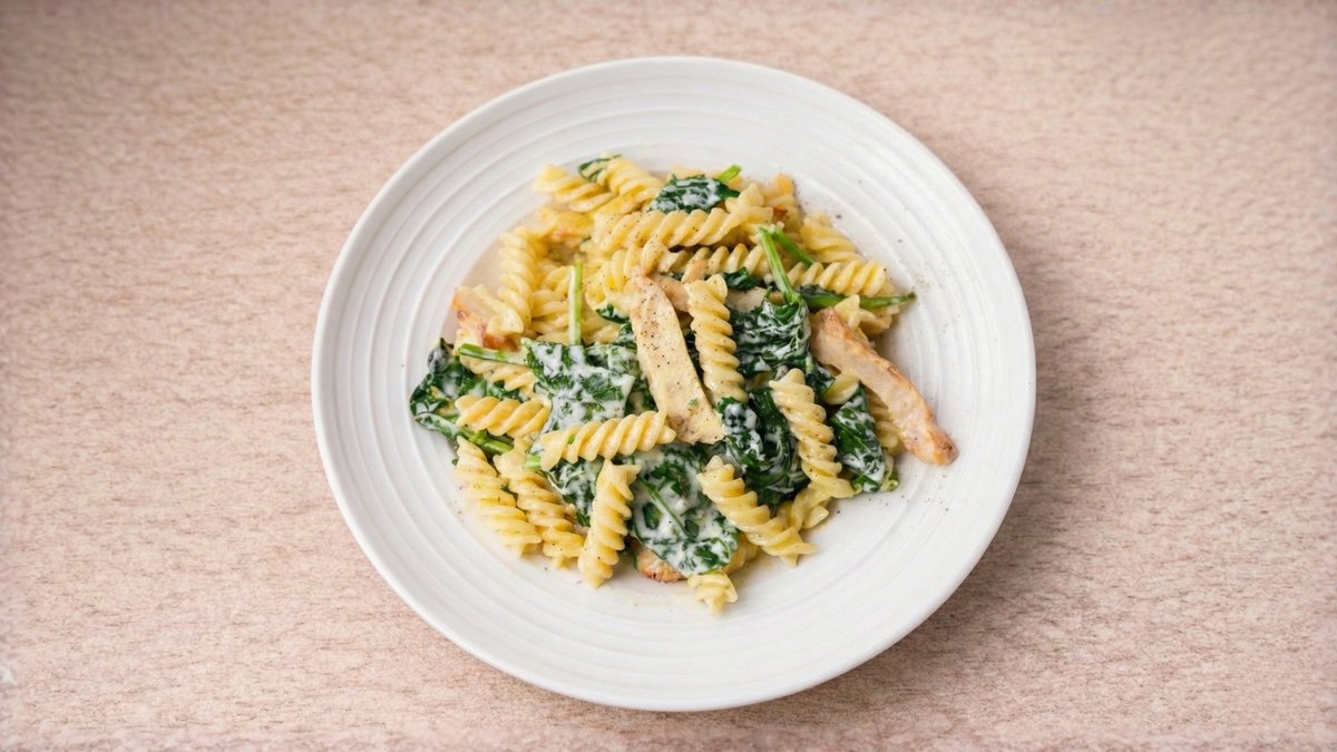 Μακαρόνια με ψητά φιλετάκια κοτόπουλο, σπανάκι σωτέ, κουκουνάρι, σε δεμένη λευκή σάλτσα με κατίκι Δομοκού