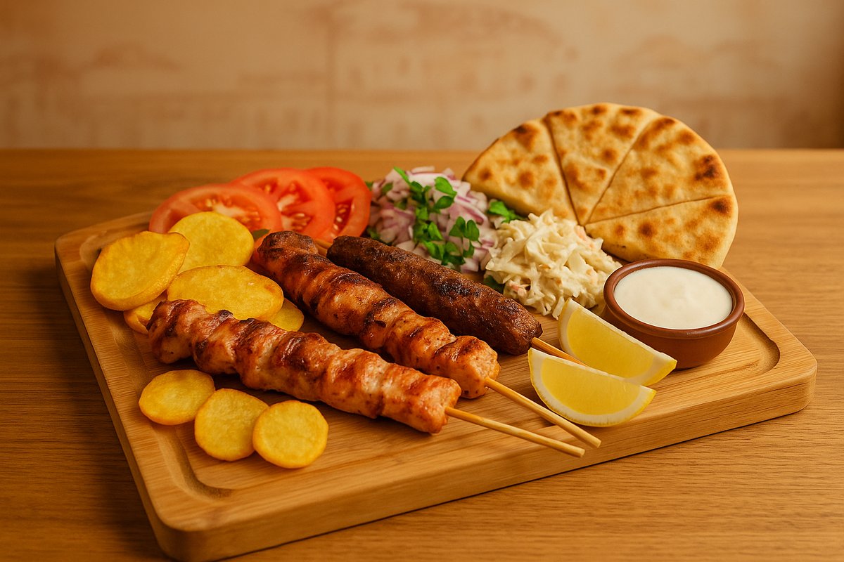 2x πανσέτες χοιρινές & 6x καλαμάκια (1 χοιρινό, 1 κοτόπουλο στήθος, 1 κοτόπουλο μπούτι, 1 κεμπάπ, 1 λουκάνικο χωριάτικο & 1 χαλούμι-μανιτάρι) 2 σως ή τζατζίκι, 2 πίτες, πατάτες τηγανητές, σαλάτα, ντομάτα-μαϊντανός, κρεμμύδι, λεμόνι
