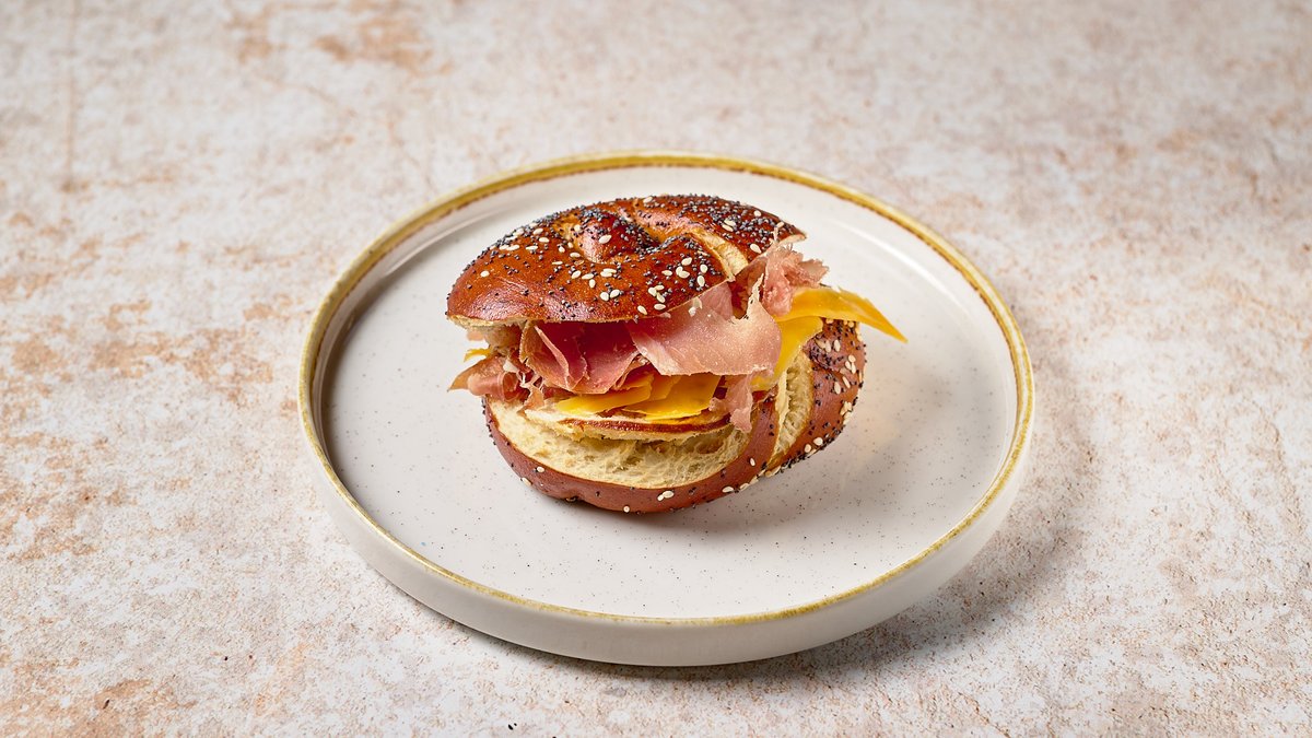 Mε μαγιονέζα, μορταδέλα, ρόκα και flakes παρμεζάνας