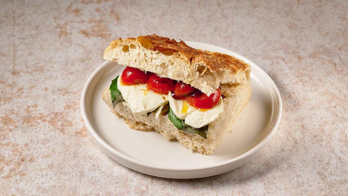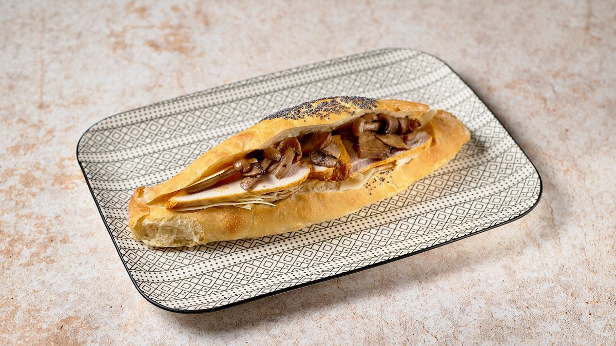 Με μανιτάρια μιξ, γαλοπούλα, ντοματίνια κονφί, κρέμα τυρί και καρβέλι ολικής
