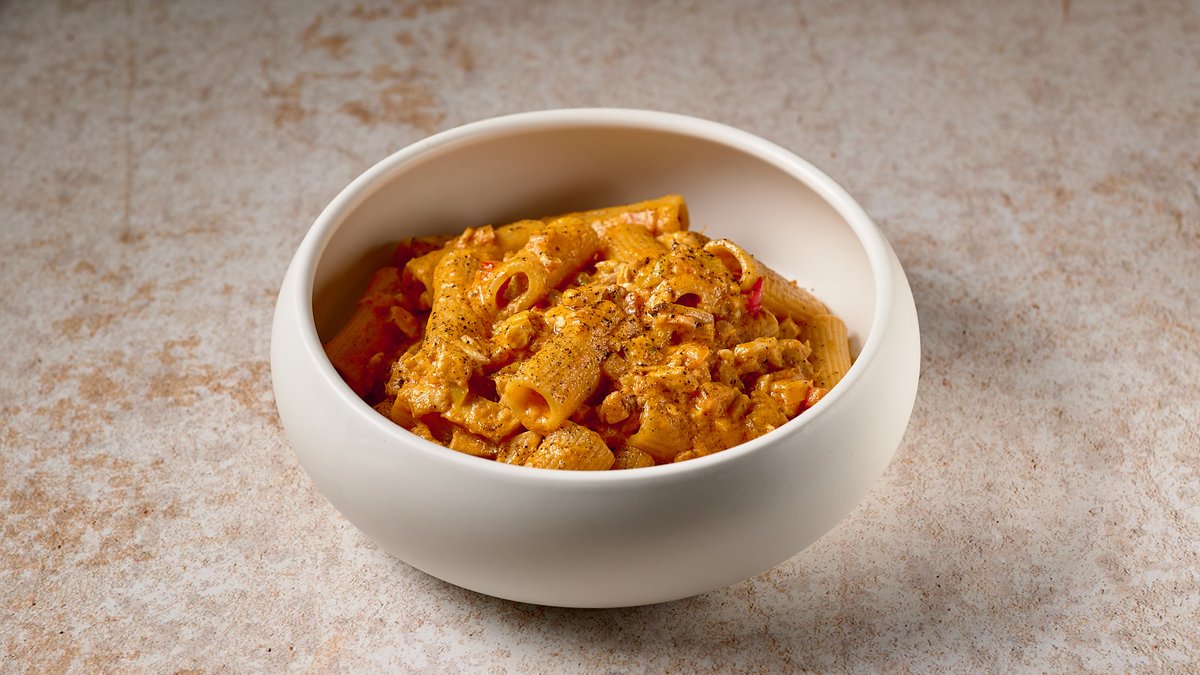 Με rigatoni, κοτόπουλο στήθος, μπέικον, πιπεριά τρίχρωμη, σάλτσα ντομάτας, κρέμα γάλακτος