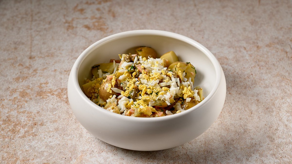 Με πατάτες baby, αυγό τριμμένο, μπέικον, κάπαρη σχοινόπραο, κρεμμύδι φρέσκο, αγγούρι τουρσί