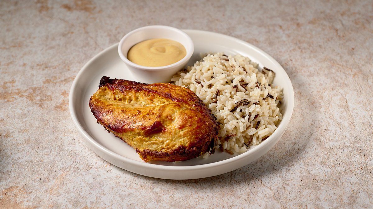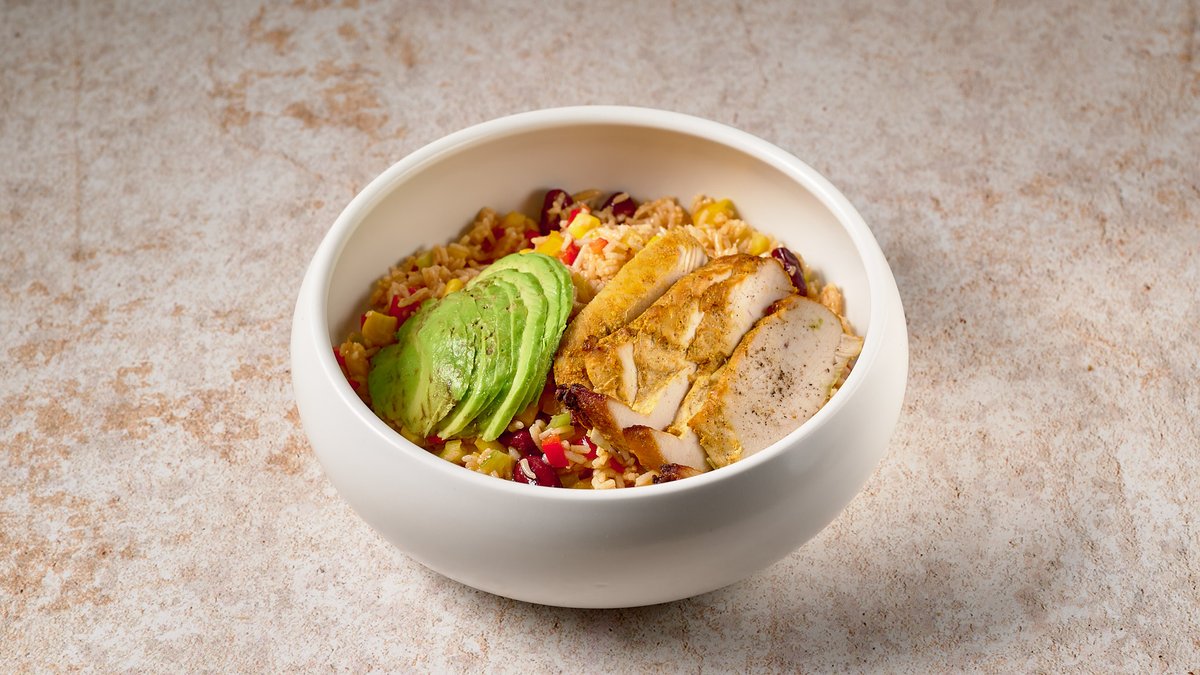 Με κοτόπουλο φιλέτο, καλαμπόκι, ρύζι, πιπεριές τρίχρωμες, μαύρα φασόλια, αβοκάντο και lime dressing