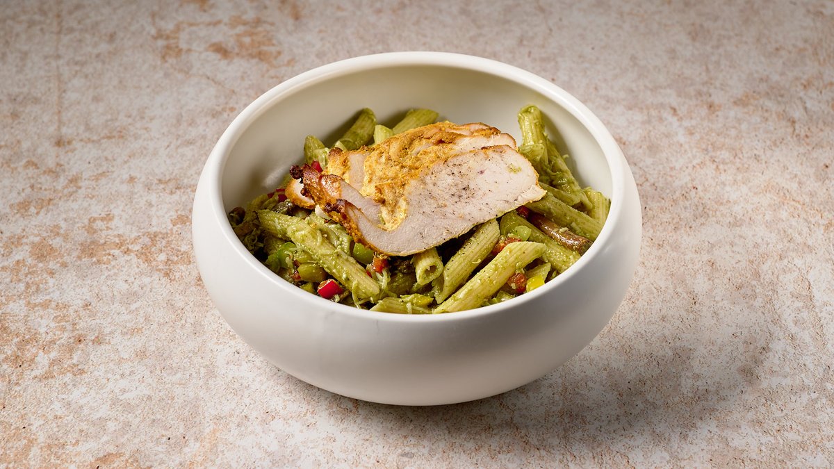 Με ζυμαρικό, κοτόπουλο, πιπεριές τρικολόρε, μανιτάρια μιξ , γραβιέρα και πέστο φυστίκι