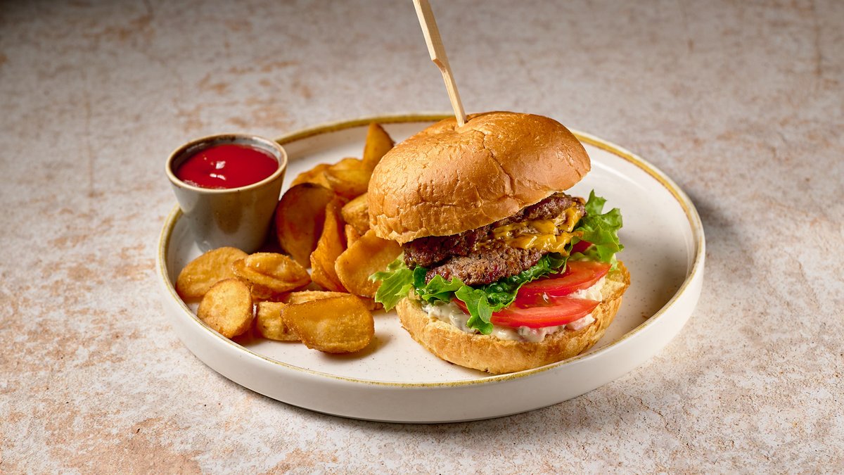 Με brioche, beef patty (50 g x2), tartare sauce, cheddar, ντομάτα και λόλα